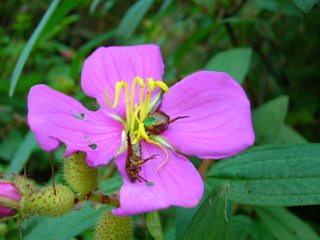 The petals of Osbeckia stelleta is in tatters and a pair of beetles seem to swing themselves in the filaments of flower. The tatters are made by none other than the pair, yet it is fair. The beetles chew the petals to satisfy their hunger and continue their tiny lives not knowing they are responsible for pollination of the flower, uniting the male and female parts of the flower. They are helping Osbeckia maintain reproductive dharma by which it perpetuates in the nature. In return they get food, shelter and recreation (if it is for them).